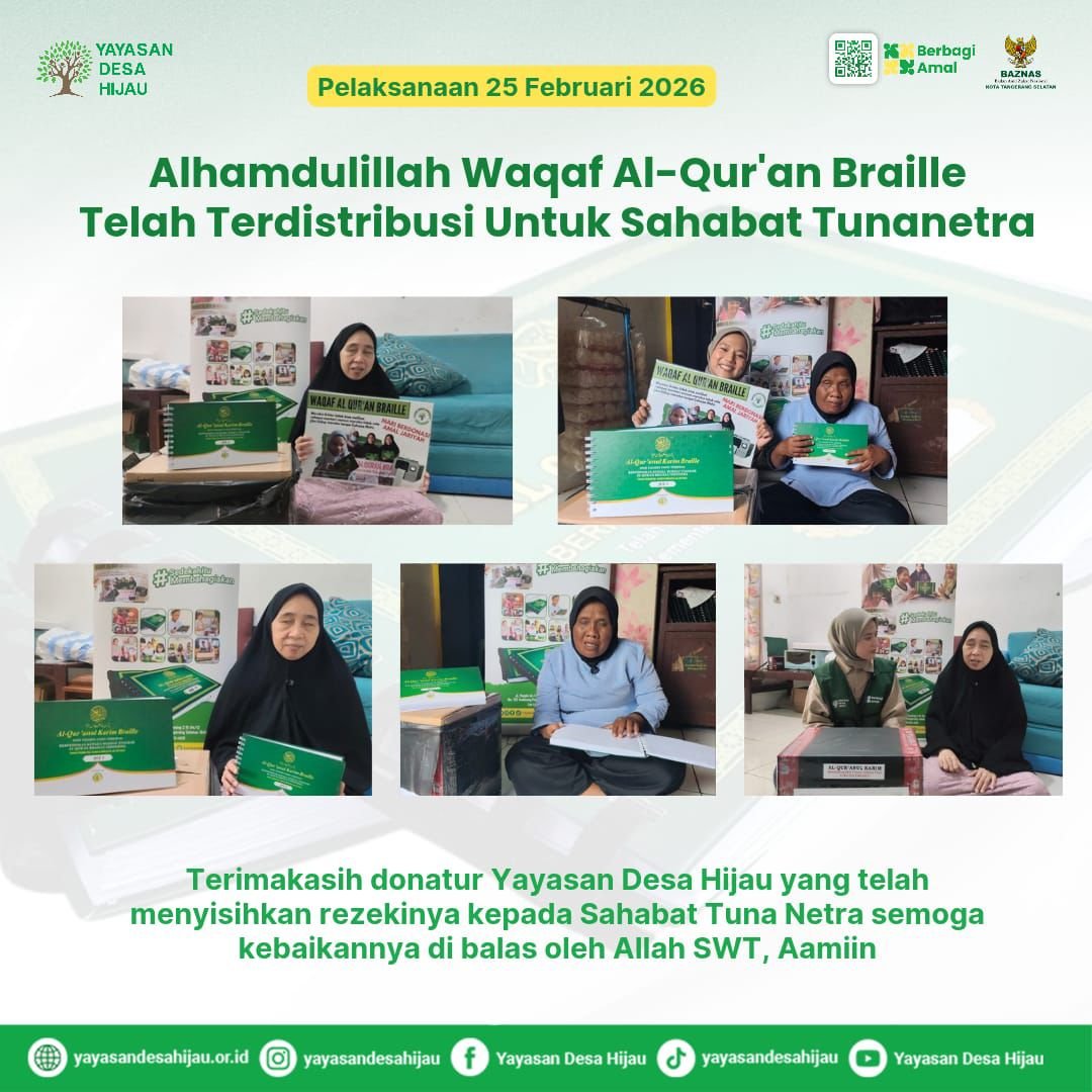 Pada tanggal 25 Februari 2026, Wakaf Al-Qur’an Braille telah sampai dan terdistribusi untuk sahabat tunanetra yaitu Ibu Oni dan Ibu Nurhayati. Senyum mereka bukan sekadar senyum biasa namun itu adalah senyum syukur, senyum bahagia karena kini mereka bisa kembali “membaca” ayat-ayat cinta dari Rabb-nya.