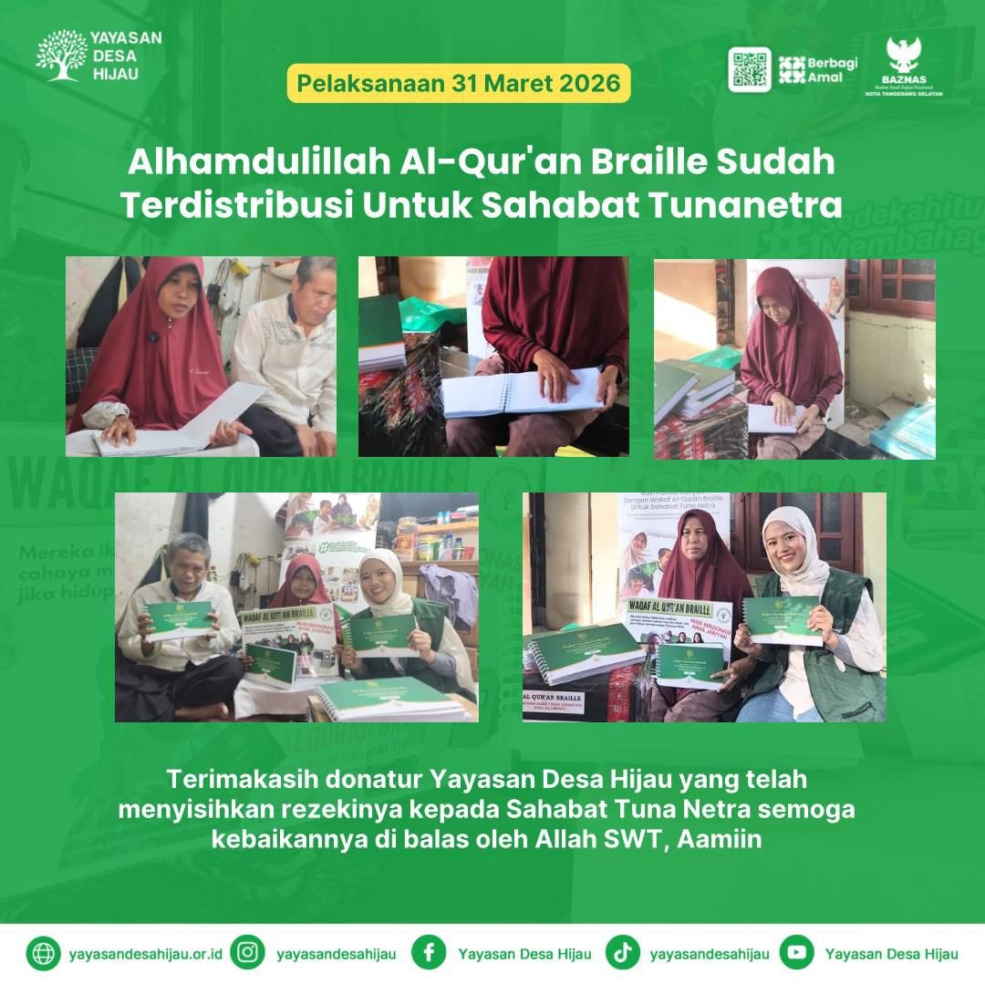 Pada tanggal 31 Maret 2026, Yayasan Desa Hijau telah melaksanakan penyaluran Wakaf Al-Qur’an Braille kepada sahabat tunanetra.