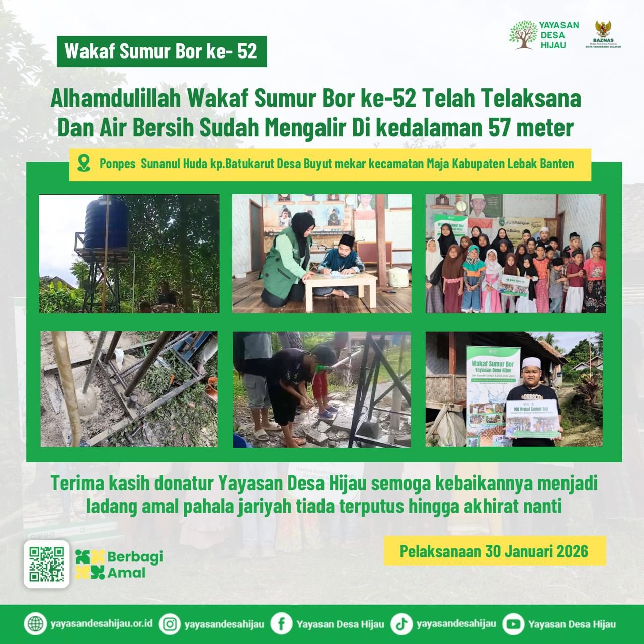 Alhamdulillah, pada tanggal 14 Februari 2026, program Wakaf Sumur Bor ke-53 telah terlaksana dengan lancar di Ponpes Bustanul Ulum, Kp. Legok Kubang, Desa Ciapus, Kec. Cijaku Lebak Banten. Dengan kedalaman mencapai 44 meter, kini air bersih telah berhasil mengalir dan bisa dimanfaatkan untuk kebutuhan wudhu, mandi, memasak, serta aktivitas belajar para santri. Senyum bahagia mereka menjadi bukti nyata bahwa kebaikan Sahabat Dermawan benar-benar sampai dan terasa manfaatnya.